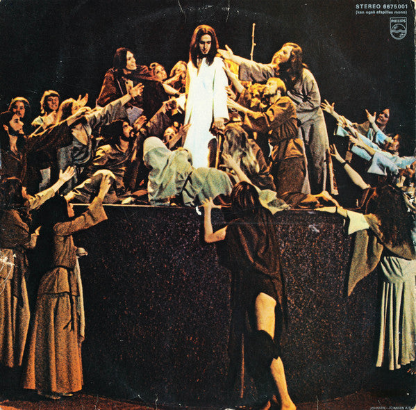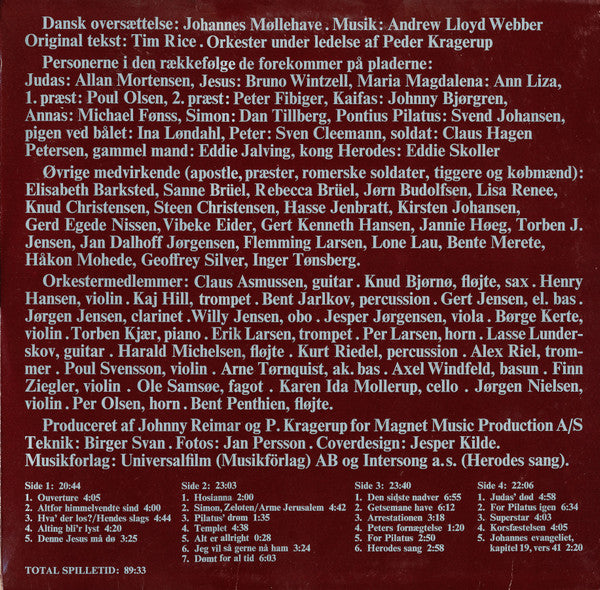 First cat. no. is on cover; second on labels record one; third on labels record two. © 1972. The original Danish version of Andrew Lloyd Webber's and Tim Rice's rock opera. Cast: Judas: Allan Mortensen. Jesus: Bruno Wintzell. Maria Magdalena: Ann Liza. Kaifas: Johnny Bjørgren. Annas: Michael Fønss. Simon: Dan Tillberg. Pontius Pilatus: Svend Johansen. Pigen ved bålet: Ina Løndahl. Peter: Sven Cleemann. Soldat: Claus Hagen Petersen. Kong Herodes: Eddie Skoller. En gammel mand: Eddie Jalving.