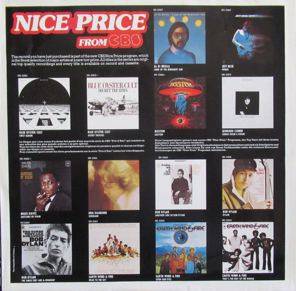 Sunburst (orange / yellow) center labels. Asterisk above side identifier. Comes with printed (Nice Price) inner sleeve Year 1982 taken from Nice Price inner sleeve © 1982 CBC Inc. On both Labels: ℗ 1967 CBS Inc. On cover: Printed in Holland Track A5 title on A side label is spelled 'Fixin' To Die Blues'.