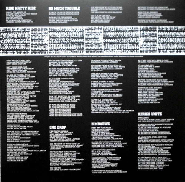© Island Records, a division of UMG Recordings, Inc. [Printed on inner lyric sleeve ℗ © 2015 Island Records, a division of UMG Recordings, Inc. All rights reserved. [Printed on back outer sleeve Made in Holland. Universal International Music B.V. Gerrit Van Der Veenlaan 4, 3743 DN, Baarn, Netherlands Recorded at: Tuff Gong Recording Studio, Kingston Mixed at: Tuff Gong Recording Studio Mastered at: Sterling Sound Studio, N.Y.C. Packaged with an inner sleeve printed with lyrics, credits, and an illustration: "This plan of a slave ship shows the stowage for the dreaded crossing of the Atlantic. The branded slaves were packed like so many non-human commodities." Printed on inner sleeve: Special thanks to: Sydney Guissine, Val Douglas, MickeyBo Richards, "Santa" J. Chin "Chico", R. Robinson, Dean Fraser "Youth", Melba Liston, Luther Franscois, Jackie Willacy, Mickey Hanson, Headley Bennett, "Sangy" Davis, Brother Jack. 180-gram LP sold individually From the box set The Complete Island Recordings