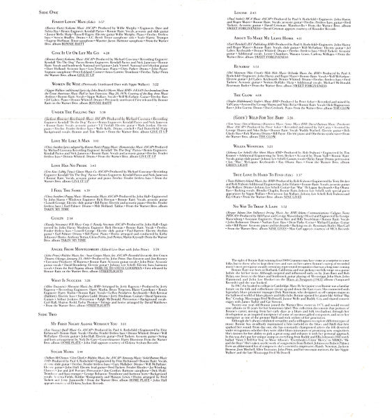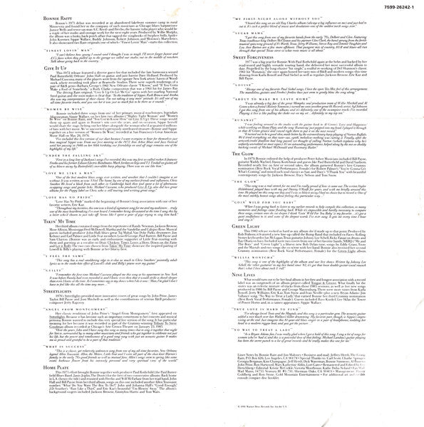 Similar to [r=2136236, but with a different circled price code on the back cover. Issued with a printed polythene lined inner sleeve. The back cover has the Warner 'W' logo embossed in the lower right corner. Track A1: Kokomo Music ASCAP From the Warner Bros. album 119950 Track A2: Kokomo Music ASCAP From the Warner Bros. album 244793 Track A3: Previously Unreleased Olwen Music BMI A KSAN live broadcast from the Great American Music Hall in San Francisco, May 26, 1976. Courtesy of the Bay Area Music Archives. First released by Bonnie Raitt on the Warner Bros. album 119950 Track A4: Benchmark Music ASCAP From the Warner Bros. album 244793 Track A5: Poppy Music / Homunculus Music ASCAP From the Warner Bros. album 244793 Track A6: Glasco Music Co. ASCAP From the Warner Bros. album 244793 Track A7: Poppy Music / Homunculus Music ASCAP From the Warner Bros. album 184573 Track A8: WB Music Corp. & Randy Newman ASCAP From the Warner Bros. album 184573 Track A9: Edited live duet Walden Music, Inc. / Sour Grapes Music, Inc. ASCAP Recorded live at the Arie Crown Theatre, Chicago, January 23, 1985 From the Red Pajama album 751507 First released by Bonnie Raitt on the Warner Bros. album 187632 Track A10: Marsaint Music, Inc. BMI From the Warner Bros. album 187632 Track B1: Quill Music Co. ASCAP From the Warner Bros. album 119954 Track B2: Walden Music Inc. ASCAP / Amnesty Music / Solid Bottom Music BMI From the Warner Bros. album 119954 Track B3: MCA Music ASCAP From the Warner Bros. album 119951 Track B4: JEC Publishing BMI From the Warner Bros. album 119951 Track B5: Mole Hole Music / Belinda Music, Inc. BMI From the Warner Bros. album 119951 Track B6: Veyler's Music BMI From the Warner Bros. album 393737 Track B7: Braintree Music / Snow Music / David Batteau Music / Porchester Music BMI From the Warner Bros. album 393737 Track B8: Hot Sheet Music BMI From the Warner Bros. album 119953 Track B9: Island Music, Inc. BMI From the Warner Bros. album 226939 Track B10: Irving Music, Inc. BMI From the Warner Bros. album 226939 Back cover: © 1990 Warner Bros. Records Inc. for the U.S. and WEA International Inc. for the world outside the U.S. ℗ 1971, 1972, 1973, 1974, 1975, 1977, 1979, 1982, 1986, Warner Bros. Records Inc. for the U.S. and WEA International Inc. for the world outside the U.S. ℗ 1985, 1989 Red Pajama Records. This compilation ℗ 1990 Warner Bros. Records Inc. for the U.S. and WEA International Inc. for the world outside the U.S. Made in Germany Inner sleeve: © 1990 Warner Bros. Records Inc. for the U.S. Labels: This compilation ℗ 1990 Warner Bros. Records Inc. for the U.S. & WEA International Inc. for the world outside the U.S. Made in Germany by WEA Musik GmbH