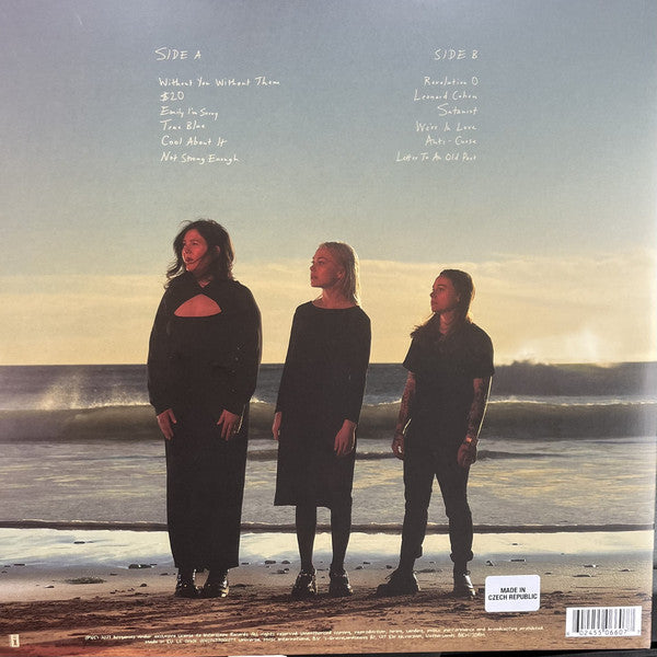 Black vinyl version issued in a gatefold sleeve. Includes a 24-page black and white zine with lyrics and photos. Hype sticker on shrink wrap front "BOYGENIUS the record 00602455066077" B6 ends in a locked groove. Made in EU (sleeve) MADE IN CZECH REPUBLIC (sticker on back of shrink wrap) (P)(C) 2023 boygenius under exclusive license to Interscope Records. Made in EU. Universal Music International B.V. 's-Gravelandseweg 80, 1217 EW Hilversum, Netherlands. Recorded at Shangri-La in Malibu, CA with additional recording at Sound City in Van Nuys, CA "Leonard Cohen" contains portions of "Anthem" by Leonard Cohen published by Sony Songs (BMI), a div. of Sony Music Publishing (US) LLC Thanks to Paul Simon for inspiration on "Cool About It"