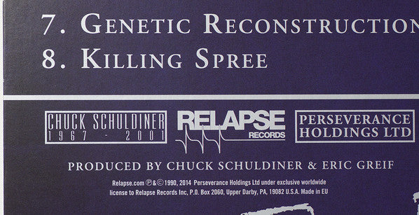 Black vinyl, 2021 repress of [r15418003 with different back cover - no barcode on back cover and the copyright notice is placed at the center left side, beneath the "Produced by..." and not at the bottom of the back cover. Includes a 4 panel LP insert, no download card. ℗&© 1990, 2014 Perseverance Holdings Ltd under exclusive worldwide license to Relapse Records Inc, P.O. Box 2060, Upper Darby, PA, 19082 U.S.A. Made in EU.