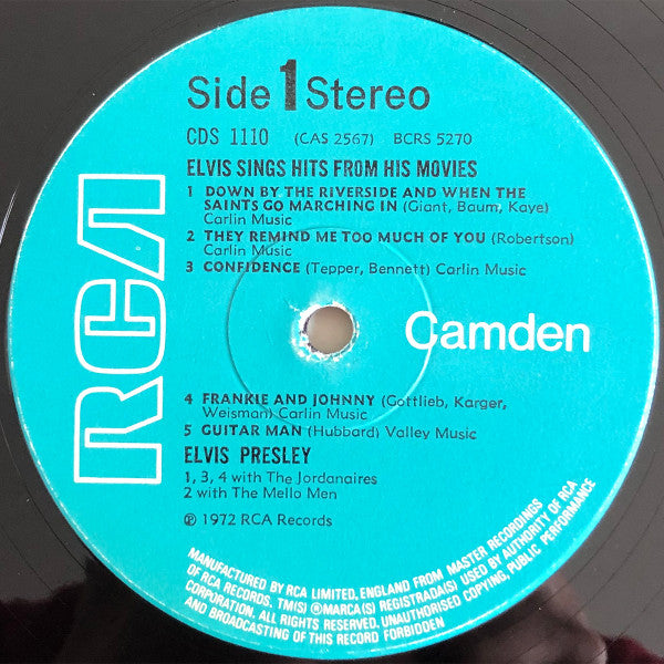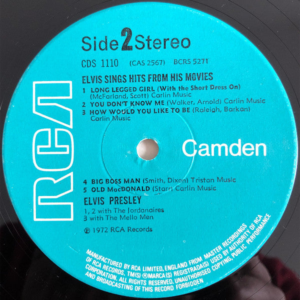 On front cover: "Elvis sings hits from his movies - plus TWO recent hits" On back cover: © 1972 RCA Limited