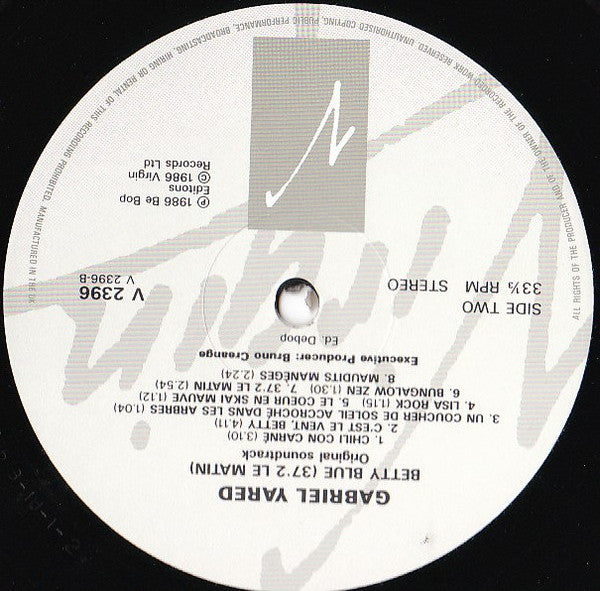 Original motion picture soundtrack. Catalog number on center labels: V 2396 Catalog numbers on cover: V2396 and 207 870 630 Studio A.D.S.R. Ⓟ 1986 Be-Bop Editions Ⓒ 1986 Virgin France S.A. on cover, Ⓟ 1986 Be-Bop Editions Ⓒ 1986 Virgin Records Ltd. on label.