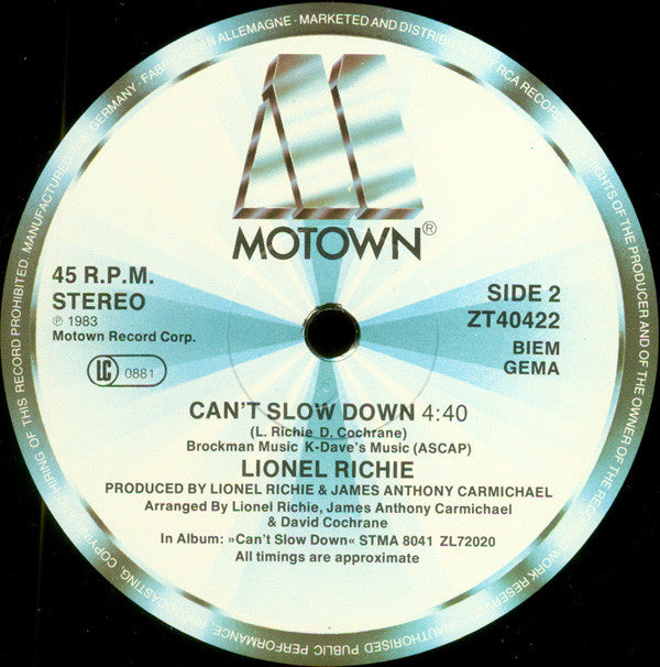Side A: Brockman Music (ASCAP) ℗ 1985 Motown Record Corp. Title song from "White Nights" Side B: Brockman Music K-Dave's Music (ASCAP) ℗ 1983 Motown Record Corp. In Album "Can't Slow Down" STMA 8041 ZL72020 All timings are approximate. Printed in West Germany. ℗ 1985 Motown Record Corporation Front Cover © 1985 Motown Record Corporation. Back Cover © 1985 Columbia Pictures Industries, Inc.