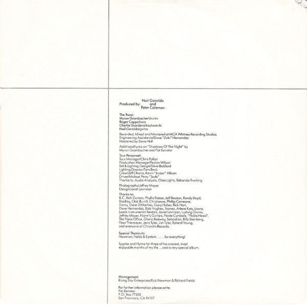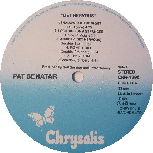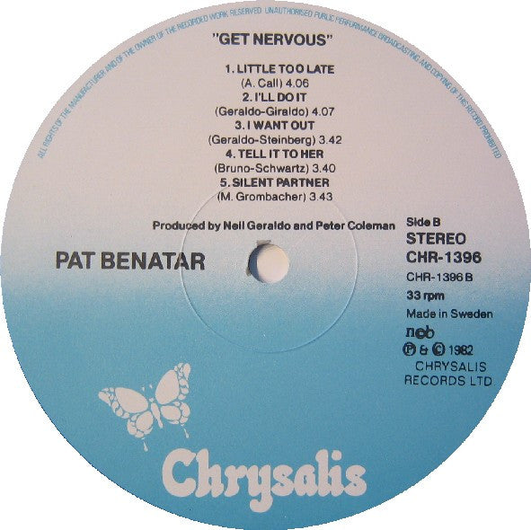 ℗ & © 1982 Chrysalis Records Ltd. Made in U.S.A. (backcover). Made in Sweden (center labels). Recorded, mixed and mastered at MCA Whitney Recording Studios. Issued with printed inner sleeve.