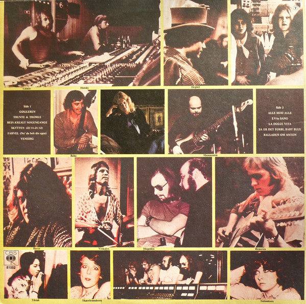 ℗ 1975 CBS Inc. / © 1975 CBS Inc. Interpak I by Shorewood Packaging / Printed in Holland, Recorded at Rosenberg Lydstudie, August 1975. Made In Holland on label rim. Track A5 reads "Farvel (Nu Er Du Helt Din Egen)" on label. Track B3 has full title inside gatefold as "La Dolche Vita (eller den abstrakte luder)". Track B4 is a coverversion over "It's All Over Now, Baby Blue". Gatefold.