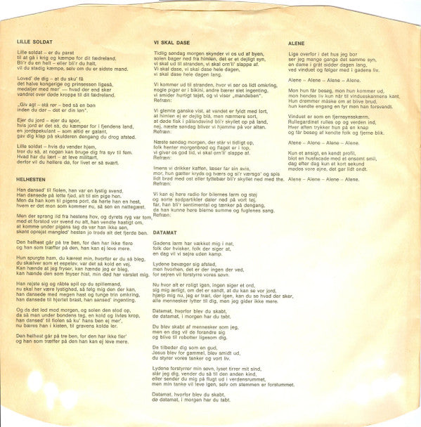 ℗ 1972. Made in Denmark. The track durations on cover and labels are very different. The durations on labels reflect the actual durations - and are used here. Track A3 reads "Mester Jacob" on label. Track A4 reads "Cajun Fiddle"on label. Track B2 reads "Flip (en lille smule natmusik)" on label. Track B6 reads "Brædtes Hopsa" on label. Comes with a printed lyrics inner sleeve.