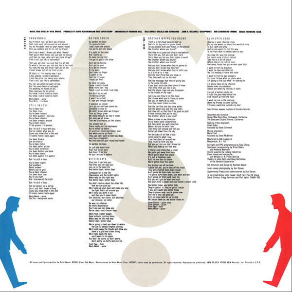 Embossed Cover Inner sleeve: lyrics, credits, artwork Sticker on shrinkwrap: "Featuring the hit single Cannonball also includes Still In Love and Better Days A&M SP-5014 Printed in U.S.A." Recorded and Mixed at Ocean Way Recording, Hollywood, California The Backyard Studio, Encino, California Mastered at Masterdisk, New York, New York Printed in USA Made in USA All Selections published by Silver Cab Music administrated by Almo Music Corp. (ASCAP)
