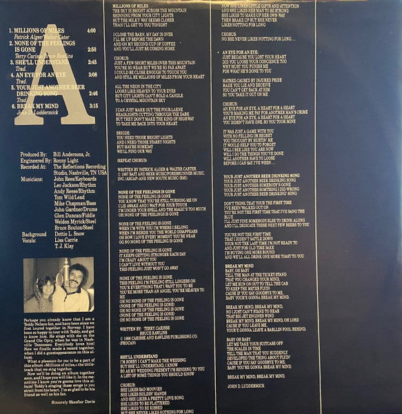 Inner sleeve with lyrics. Distribution: Sverige: Skandinaviske Grammophon, ... Norge: Nonstop Musicservice A/S, ... Danmark: Kavan Music, ... Recorded at The Reflections Recording Studio, Nashville, TN, USA. Grafisk produktion: ABC-Bureauet Made in Holland