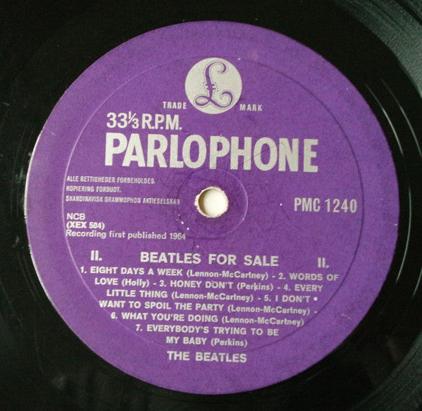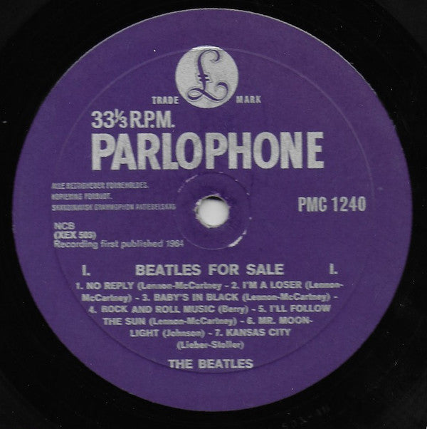 Purple label. "Recording first published 1964" on the left under label matrix code. Publishing info: A1 to A3, A5, B1, B4 to B6 - Northern Songs Mus. NCB. A4 - Jewel Mus. BIEM. A6 - Chappell. Mecolico. NCB. A7 - Macmelodies. Mecolico. BIEM. NCB. World Music B2 - Southern Mus. NCB. B3 - Aberbach (Ldn.) Ltd. BIEM. B7 - Knox Music. BIEM