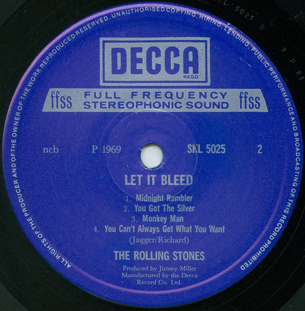 Backcover: Tracklist given in random order. © 1969, The Decca Record Company Limited, London. Center labels: Main artist reads The Rolling Stones. ℗ 1969. Manufactured by the Decca Record Co. Ltd.