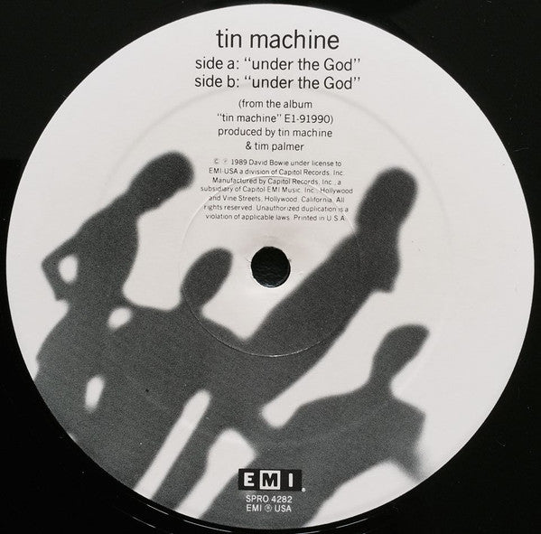 Comes in a stickered white die-cut sleeve. Small pink sticker reads: when you PLAY IT, SAY IT! MIC 61527 Big Orange sticker reads: under the god the first track and video from the forthcommig album, "tin machine" tin machine is david bowie reeves gabrels hunt sales tony sales written by david Bowie produced by tin machine & tim palmer spro 4282