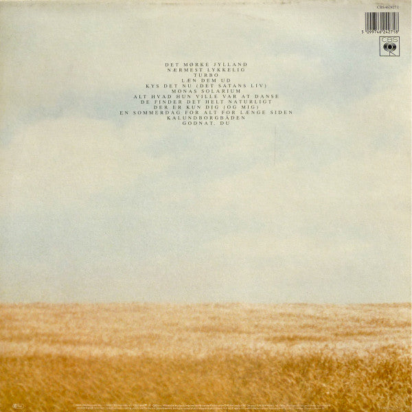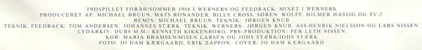 Track A1 to A4, B1 recorded in Werners Studie. Track A5 to B1 to B6 recorded in Feedback Studiet. Recorded Spring / Summer 1988. Mixed in Werners. ℗ 1988 CBS Records aps. © 1988 CBS Records aps. Made in Holland / Printed in Holland. Distribution CBS Records / CBS Disques S.A. Issued with printed inner sleeve.